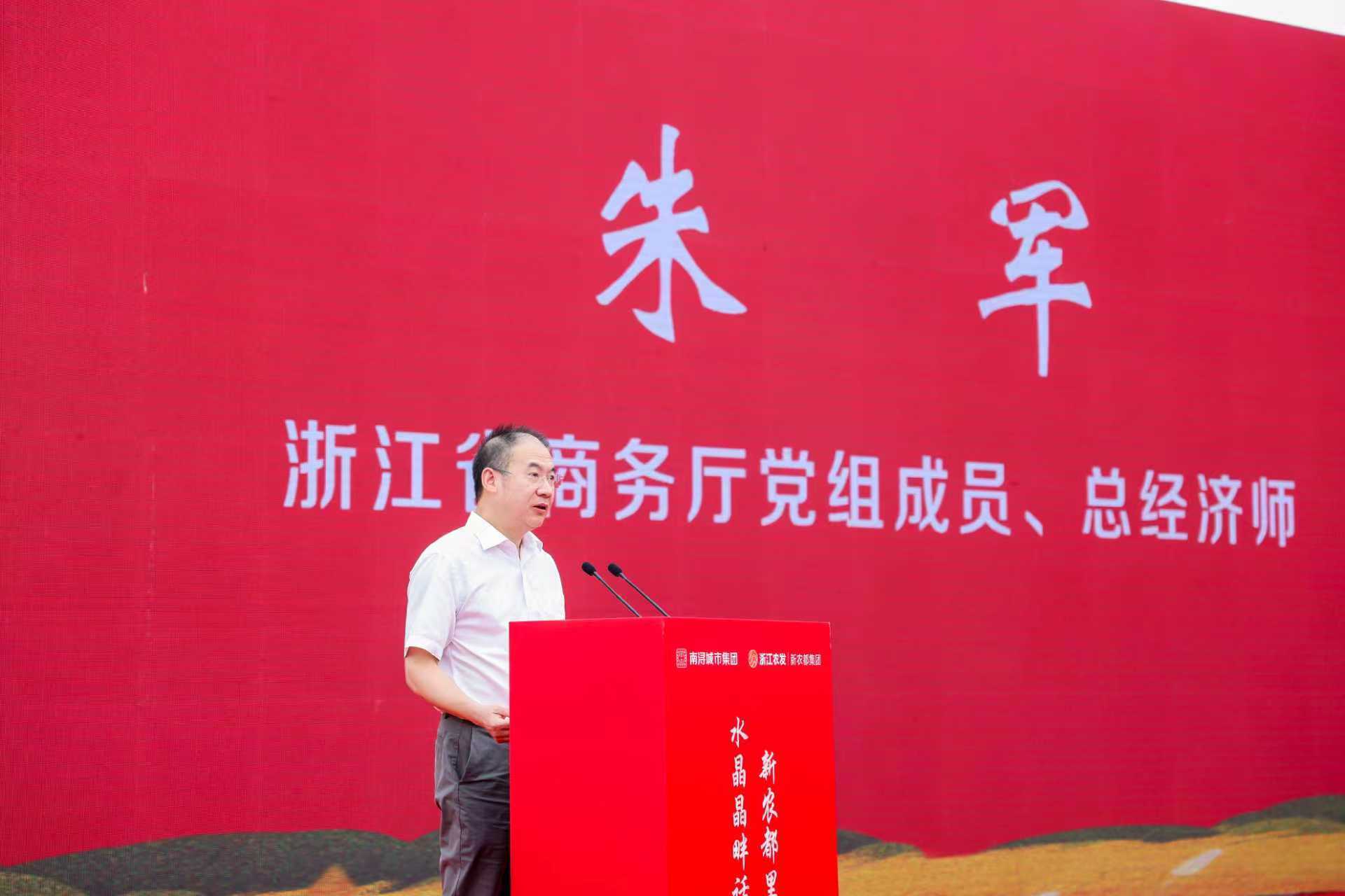 朱军在致辞中指出,农产品流通体系建设事关重大,浙江省正推进相关体系建设,南浔新农都主动融入全省保供体系,立足区位优势打造现代化流通枢纽,且创新“常规交易+应急保障”运行模式,畅通了供应链,实现了保供稳价、助农增收。他强调,市场要以开业为起点,坚持高标准发展,打造长三角重要流通枢纽,守牢安全线、提升软环境、打通致富路,推动全省农产品流通体系建设,助力民生与乡村振兴。